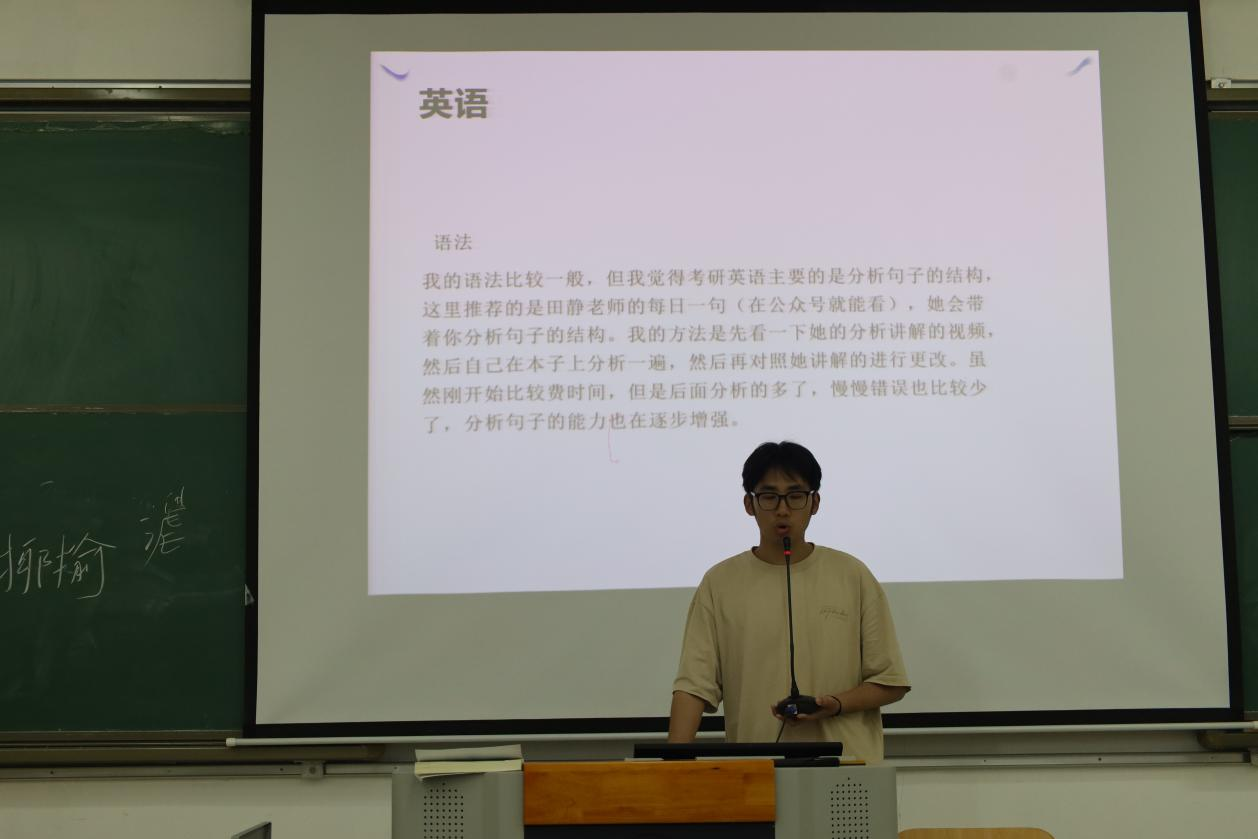 向思强(录取于湖南师范大学)的分享则聚焦于考研英语、政治和专业课的学习方法。针对英语,他分享了两种有效的背单词方法:一是借助单词软件记忆;二是在真题中边做边记。此外他还强调了学会分析英语句子结构是十分必要的,并建议同学们多练习真题,以熟悉题型并掌握答题技巧。针对政治,他建议同学们做题时将错题标注,并利用碎片化时间针对性地复习巩固。针对专业课,他建议先整体把握专业书内容,形成宏观知识框架,再根据重难点进行深入学习和理解,还需结合背诵和做题反复巩固所学知识。
