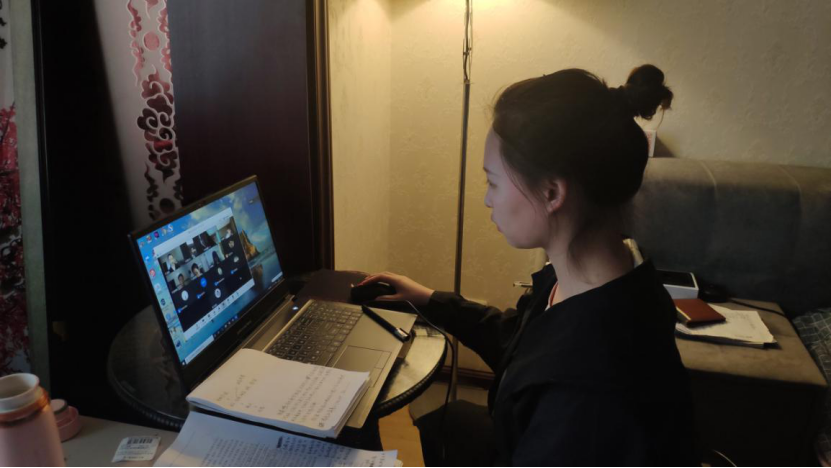 (图为参加线上答辩的学生做好准备在电脑前等待答辩)