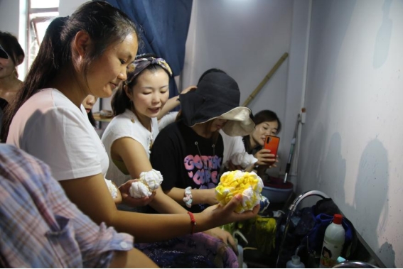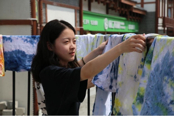 彭艺(左二)教同学扎染