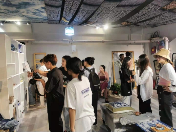 当2019级传播学专业全体学生踏入彭艺工作室时,一场奇妙的非遗文化之旅就开始了。彭艺早已做好当讲解的准备,她说:“跟着我走,我带你们一起体验非遗文化。”“旅行团”的同学们紧跟彭艺的脚步,参观她亲自设计的各种产品,有蜡染玩偶、刺绣抱枕、陶瓷茶具、蜡染屏风、刺绣绢扇等融合了少数民族元素与特色的产品,抵不住诱惑的同学们正式转为游客,开启了买买买模式。