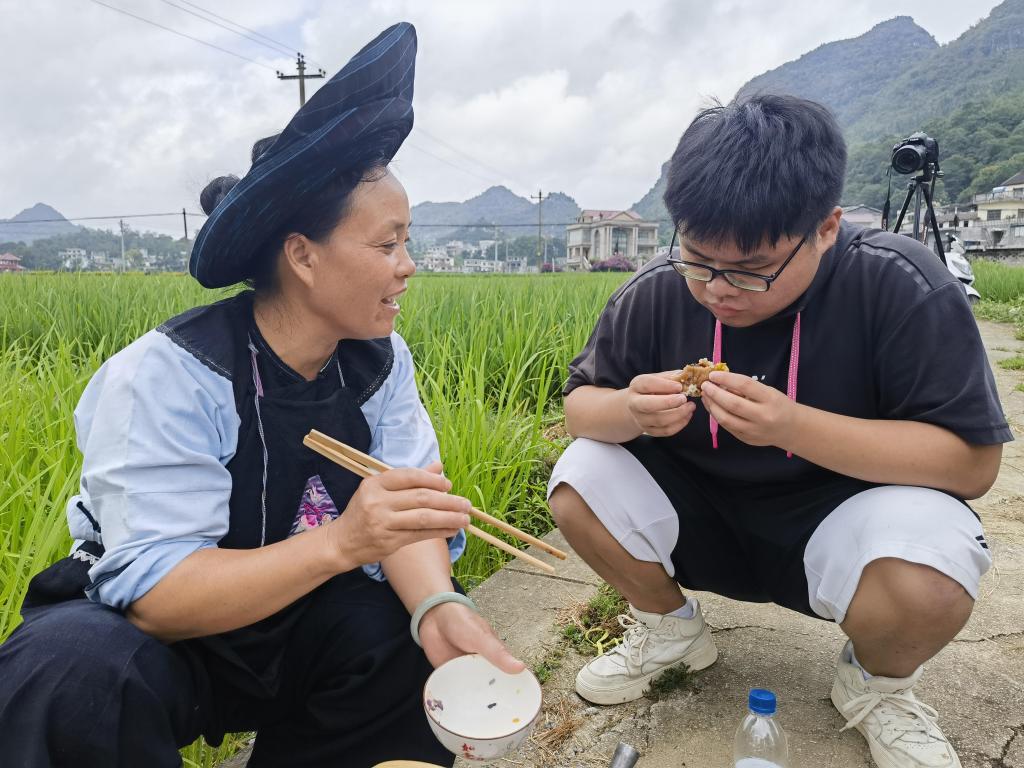 学生们尝试布依族村民的祭田美食