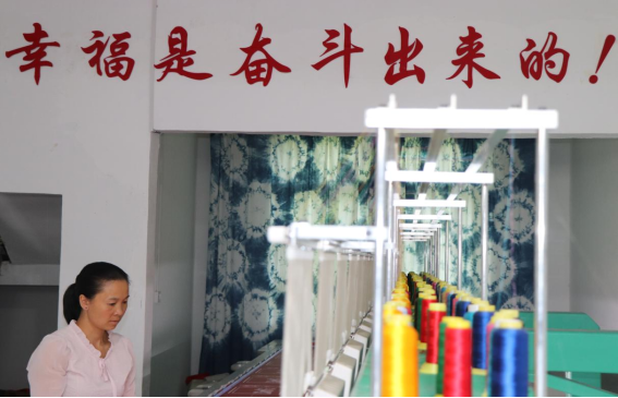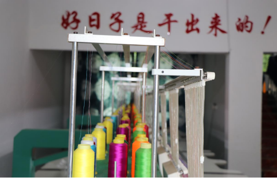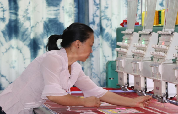 在刺绣厂车间,黄梅正在调试机器,“机器不比人工,你要盯紧了,有一点丝线打结都会阻止机器运作。”在车间的上方,赫然展示着“幸福是奋斗出来的”、“好日子是干出来的”几个显目的大字,正如标语所言,刺绣厂平日里有10多名苗族妇女务工,每月平均有10万多元人民币的订单,妇女们靠一门精湛的刺绣技艺一针一线“绣”出了致富之路。