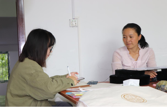 调研团队在对富纳刺绣厂负责人黄梅进行深度访谈