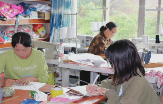 调研团队拍摄富纳刺绣厂车间正在画蜡的苗族妇女