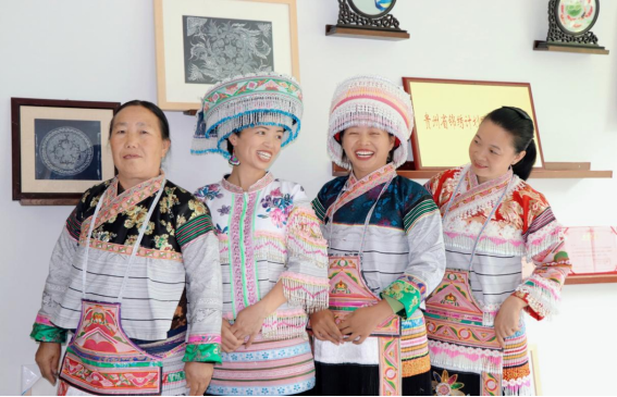 富纳刺绣厂负责人黄梅(右数第三位)邀请调研团队成员穿上当地苗族的盛装一起合影