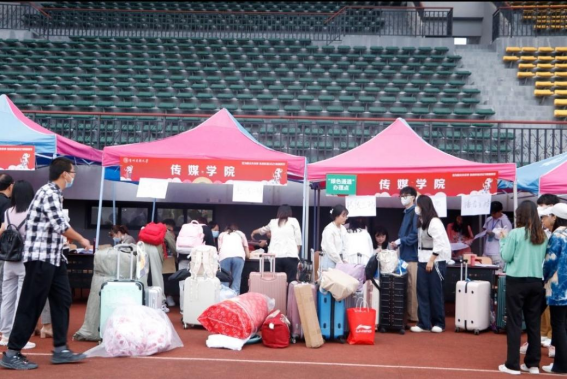 在田径场上设置了报到登记处、行李暂放处、绿色通道等。同时,每个环节都有志愿者学长学姐热情引导,细心服务,协助新生办理入学事宜。