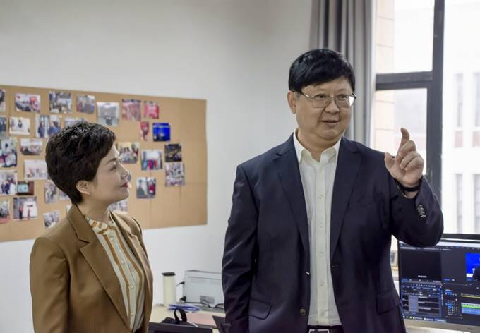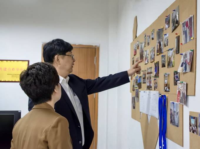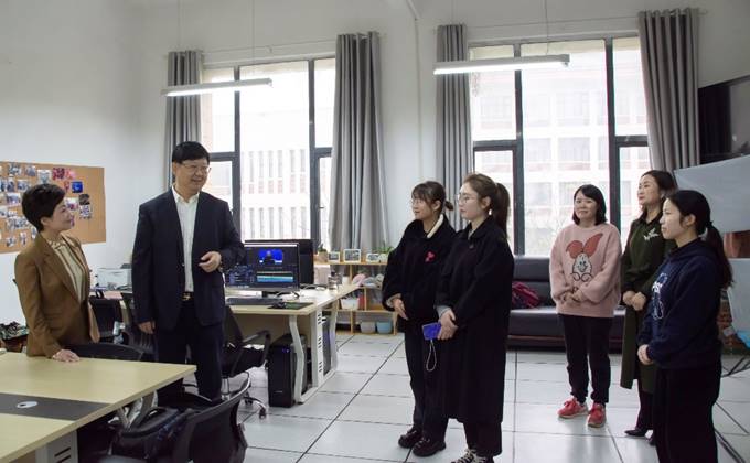 “薪传工作坊”,褚书记的目光一下子被工作坊文化墙上的照片所吸引,照片记录了工作坊师生的工作点滴和学习日常,他对传媒师生的工作学习给予肯定。