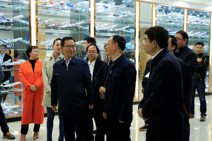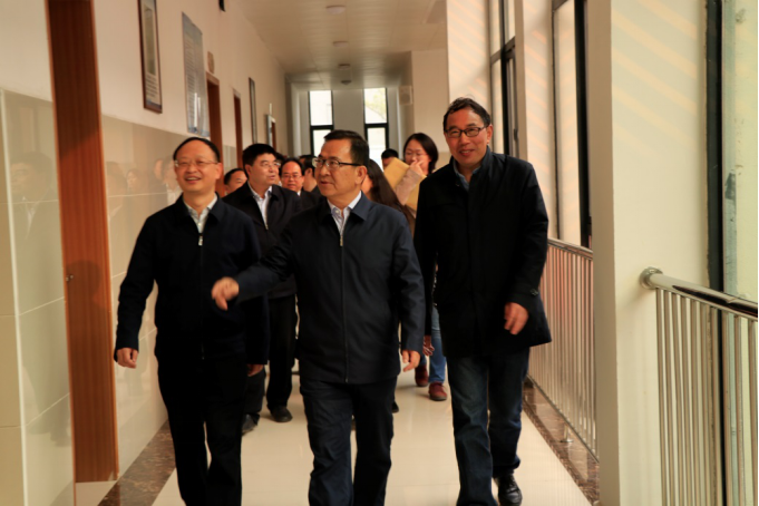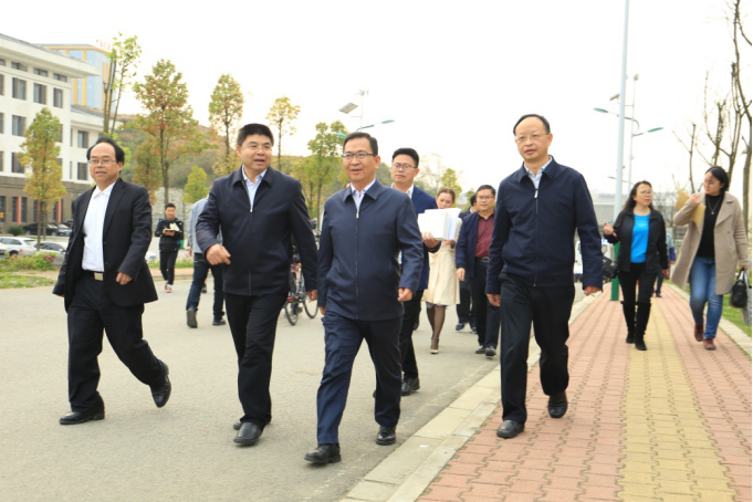 校党委书记张学立(右二)、校长陶文亮(左二)、与多彩贵州网党委书记、董事长陈麟(右一)参观学校