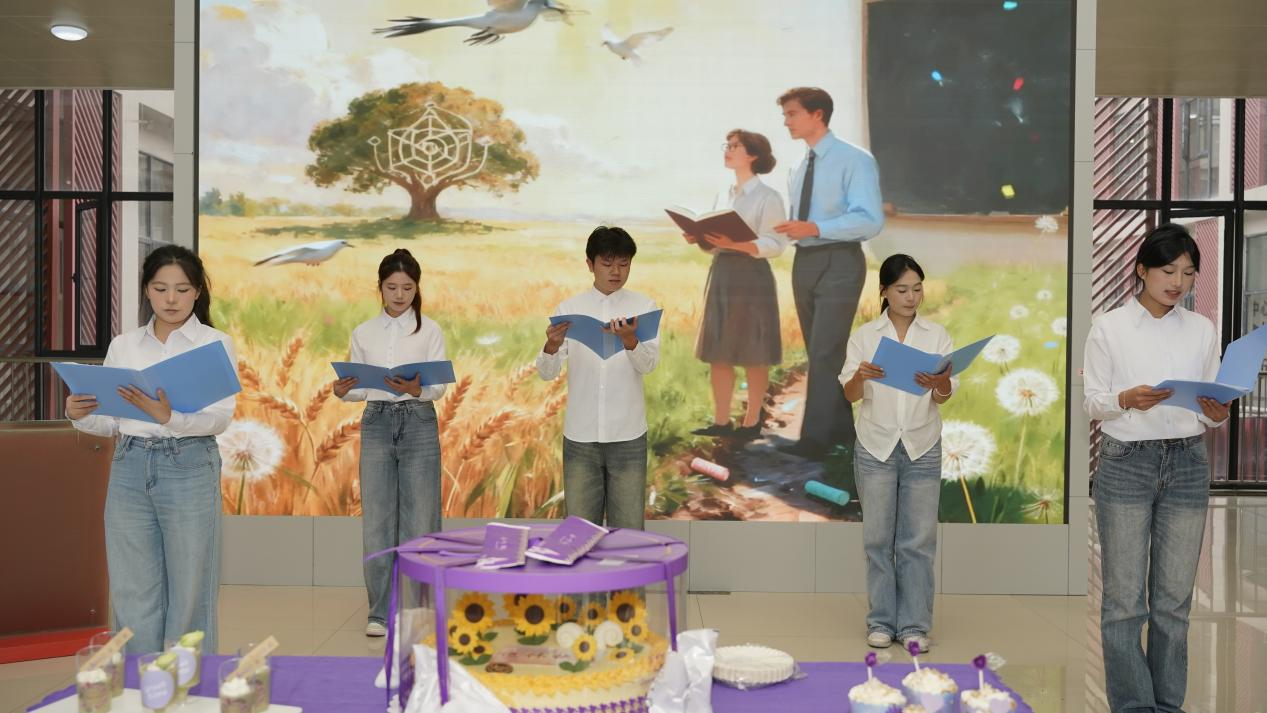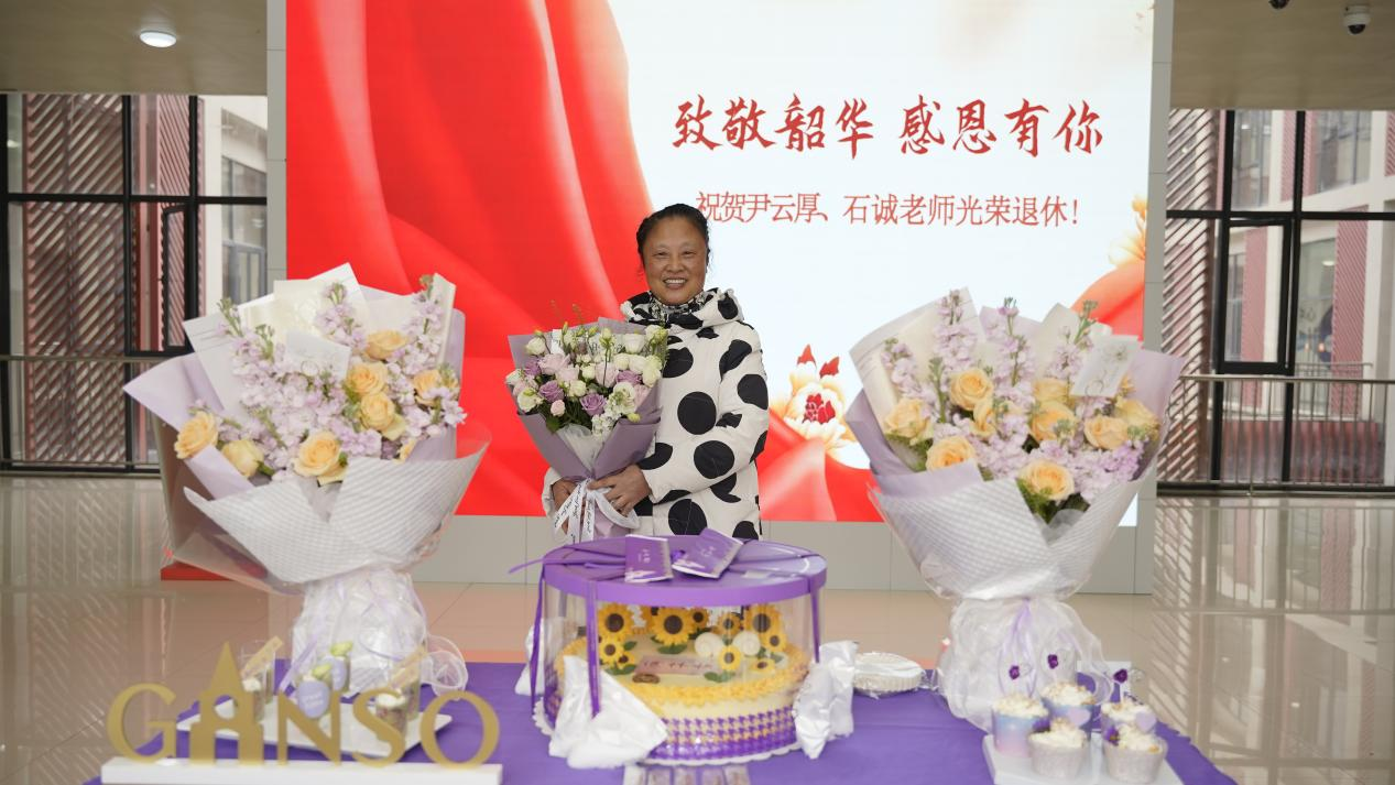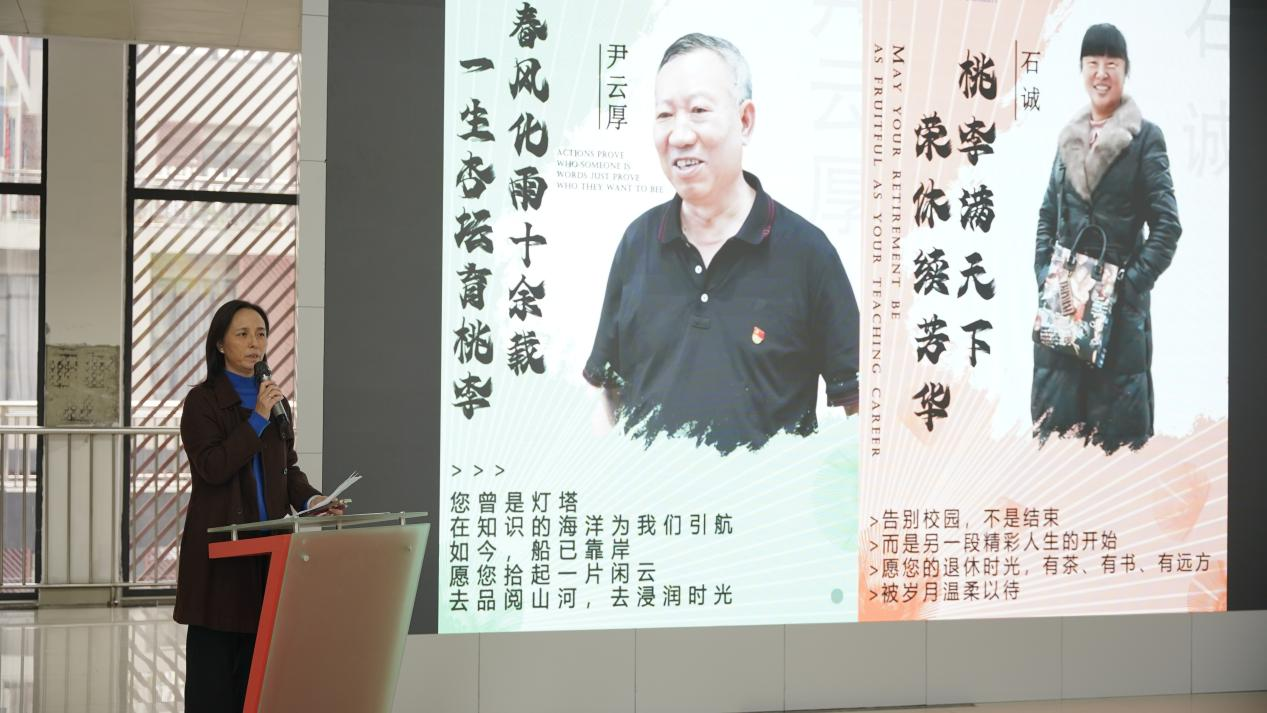最后,石诚老师做荣退发言。她希望各位老师能把握当下、为社会多做贡献,并表示自己退休后也会坚持学习,同时对学校发展献出美好祝愿。“退休后我会享受生活、学习新知识、保持健康心态。祝愿学校蒸蒸日上,同事们身体健康!”