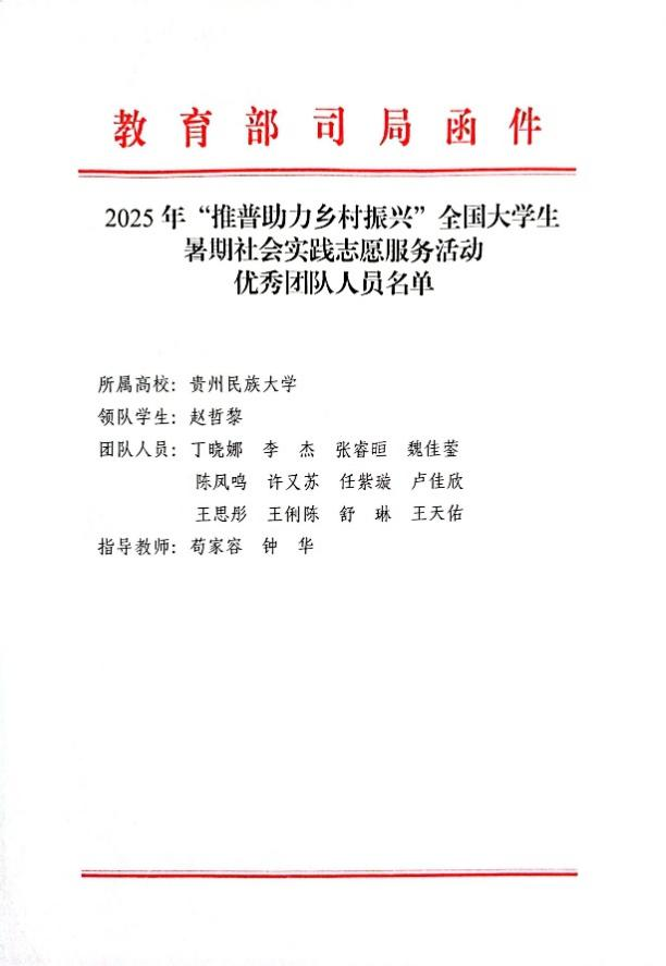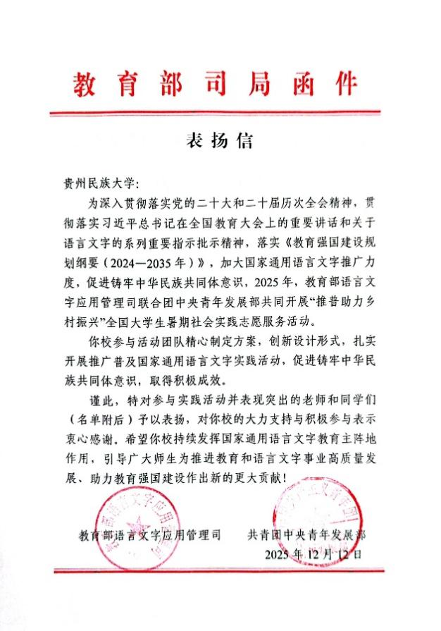 “薪火黔进”推普实践团队又凭借扎实成效获得教育部及团中央联合表扬。