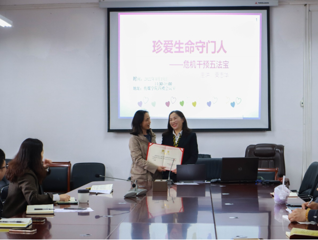 党委书记吕映红为粟志华老师颁发聘书,聘请她为学院心理咨询师,并对粟志华老师一直以来支持关心学院学生心理健康工作表示衷心感谢。