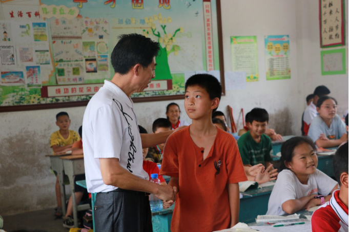 (图为都坪小学校长向章程在鼓励学生 刘丽摄)