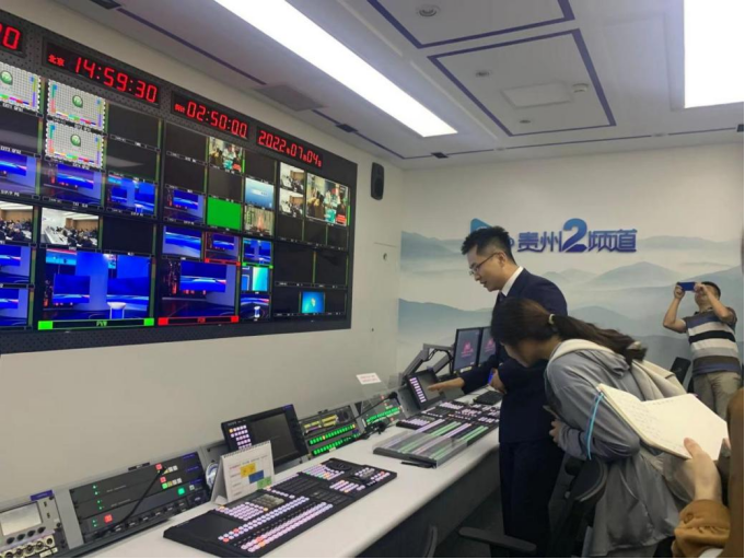 随后,31名学生分成三组,在三位接待老师的带领下依次对贵州广播电视台各部门进行参观。首先由《百姓关注》主播王威带领学生参观了导播台和演播厅,详细介绍了节目的策划、待机彩排、进行直播以及接收观众电话的采、编、播一体融合;时政区、民生区、新媒体以及参观区域既可独立使用,又可相互协调配合,能满足全景别、全媒体和交互式的应用需求。在参观期间,部分同学在王威主播的邀请下坐上主播台,感受了一次面对镜头的主播视角。