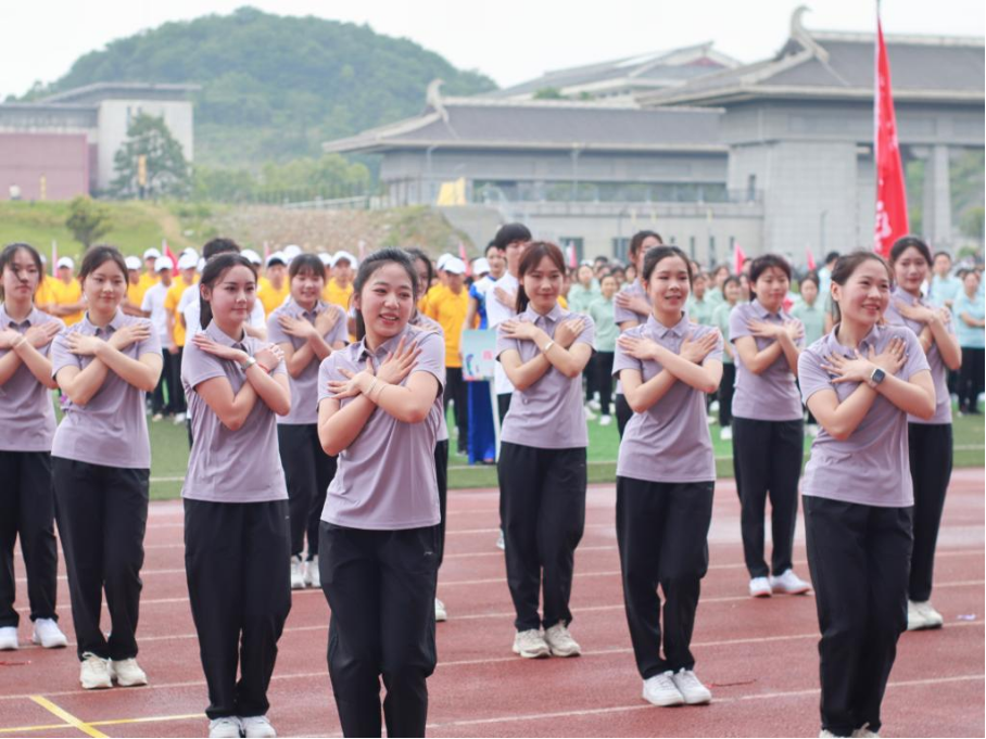 代表方阵伴随着第九套广播体操的节拍,伸手、转体、下蹲、跳跃……动作舒展大方,尽显体操的力量与美感,展现了传媒师生良好的精神面貌与体育精神。