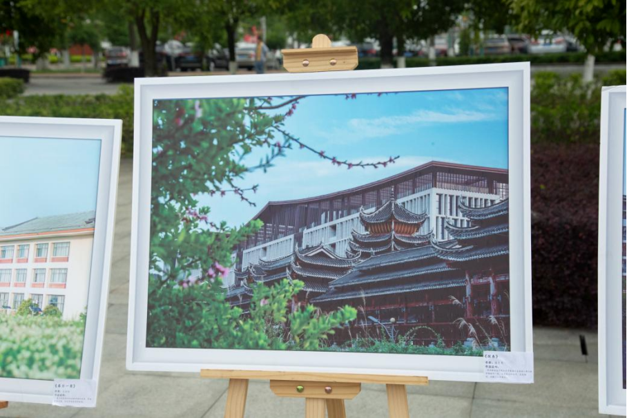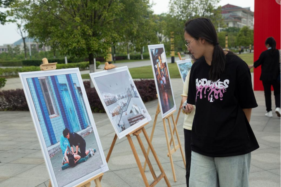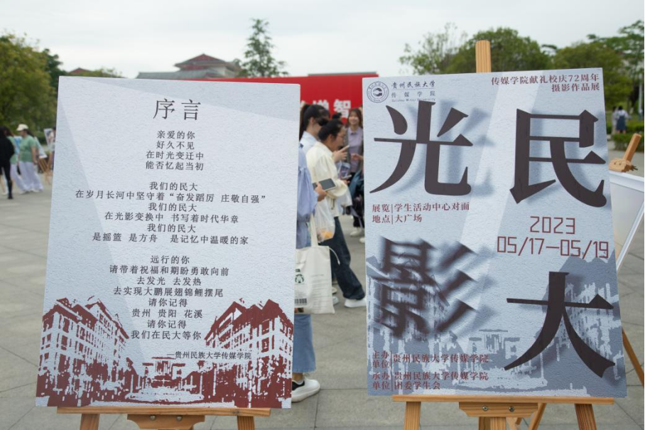 在大学城校区广场上举办“光影民大”摄影作品展。