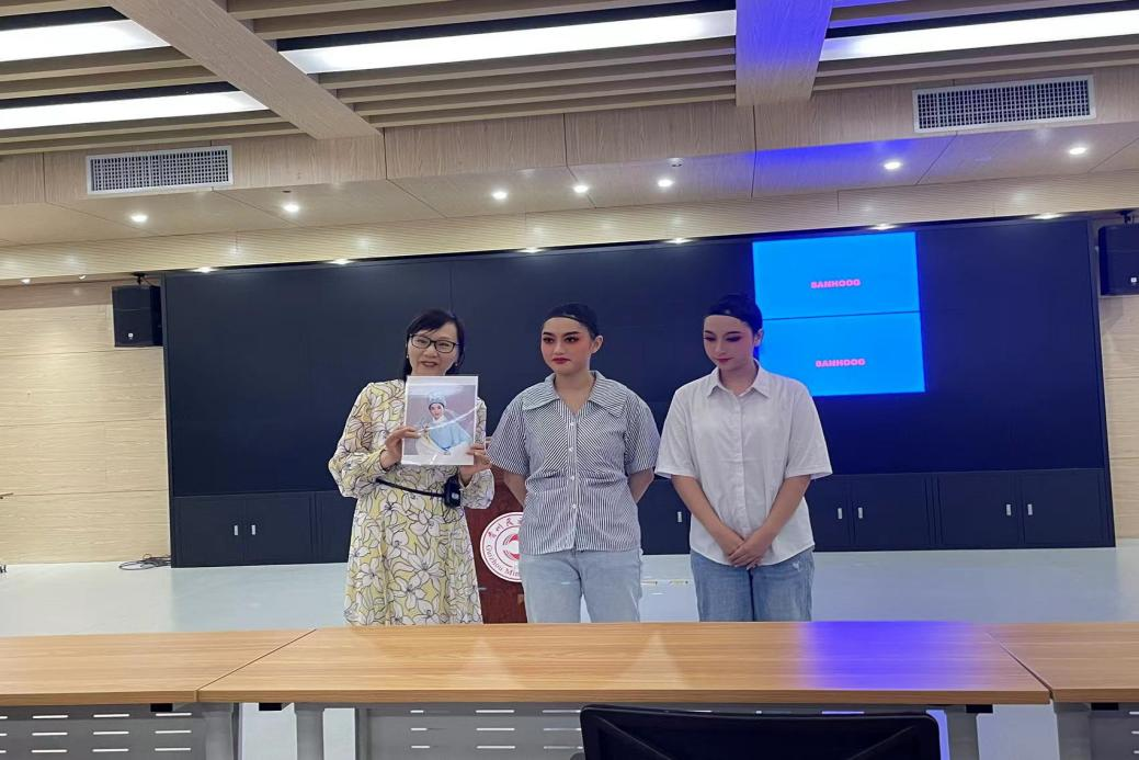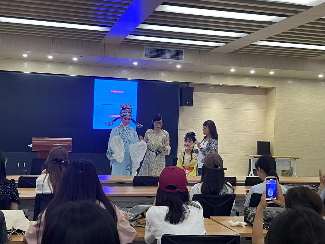 张鸿艳老师首先向在座学生介绍何为越剧、越剧的诞生及发展,讲解越剧基本常识、特点以及经典剧目等内容。接着,她展示了越剧服饰、越剧演员妆容,并教授学生们试唱戏曲、模仿演员动作神态,师生现场互动积极、气氛活跃。