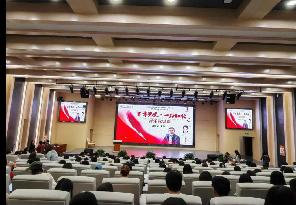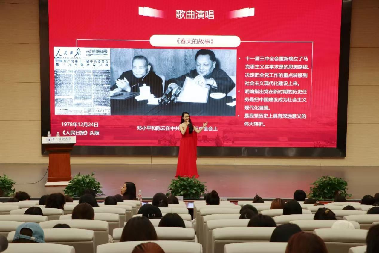 讲座过程中,王韦韦老师以清亮的嗓音演绎了《映山红》《我的祖国》《春天的故事》等经典红色歌曲,歌声悠扬,感情真挚,生动诠释了中华民族从站起来、富起来到强起来的奋斗历程。唐建荣老师则以深度解读,进一步彰显了中国共产党在革命建设中的核心领导作用。