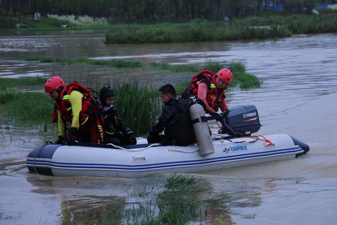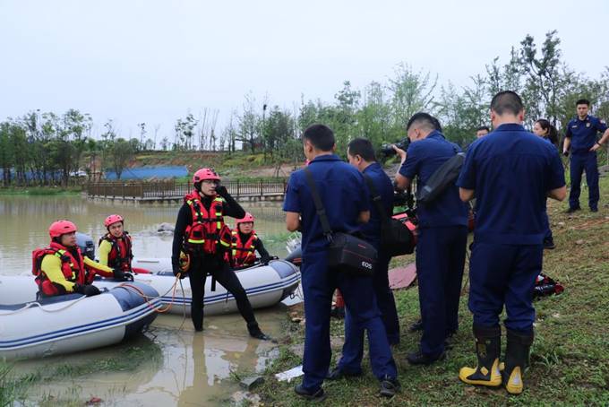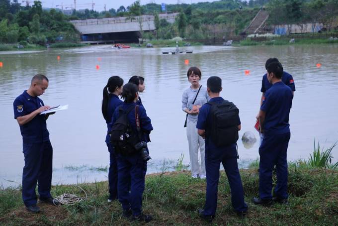 水域救援演练开始前,贵安支队作战训练科蒋健站长介绍演练流程:此次抗洪抢险水域实战拉动演练假定因汛期突发洪涝灾害造成房屋被淹,有若干人落水,经侦查,明确被困人员位置后,形成4个救援科目。第一步,采取营救水面上的落水人员;第二步,营救被困房屋上面的人员;第三步,营救溺水人员,这需要派出两名潜水员下水,同时运用无人机确定溺水者位置,然后把溺水人员救出;第四步,是设置一个孤岛,架设一个横渡系统在水面上,把游艇开过去,救出被困人员。
