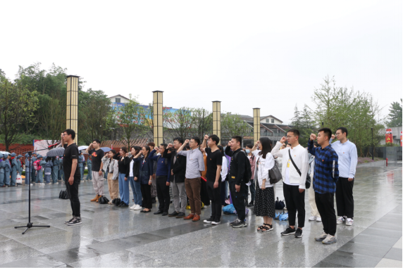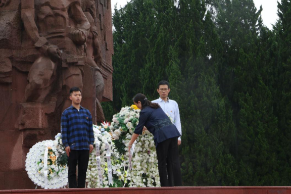 最后纪念馆广场雕塑前全体党员革命先烈敬献花篮,面向党旗,在研究生第二支部杜凯同志的带领下重温入党誓词。