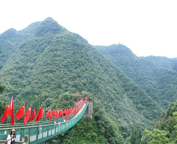 连接小尖山与大尖山的这座桥,叫长空桥。长空桥取名源于毛泽东《忆秦娥娄山关》词句“长空雁叫霜晨月”。该桥长100米,宽5米,为铁索木板桥。