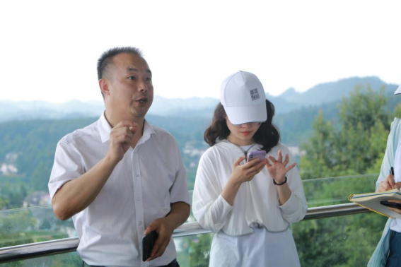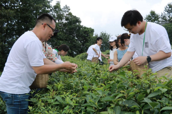湄潭县的金花村27°景区是他们此次调研目的地之一,金花村股份经济合作社总经理刘建顺在27°景区向大家介绍了湄潭茶旅一体化发展情况,清华学子挎上竹筐,跟着茶农现场学起了采茶。
