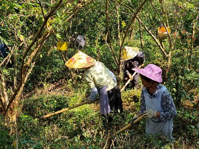 茶园里,工人们正在除草