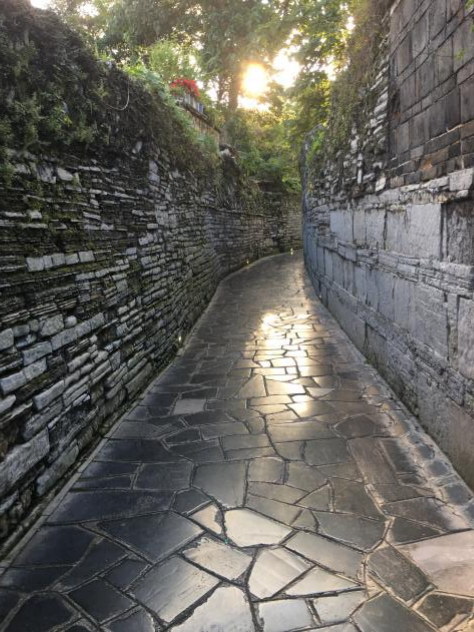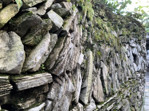 青岩最不缺的就是石头,背街这条小巷就是由青岩当地特有的页岩砌成的。背街的粘合剂十分特殊,它是以条石、块石、团石和不规则石块用糯米浆、桐油、石灰粘合砌筑,而页岩的特色形态,使石巷的细部纹理显得十分丰富,兼具自由与规则的特点,显得静谧悠长。贵州阴雨连绵,而这种特殊的粘合剂使得背街能够在青岩古镇中屹立三百年而不倒,这也是背街“历久”的真实原因。