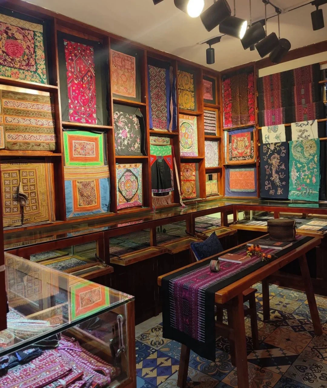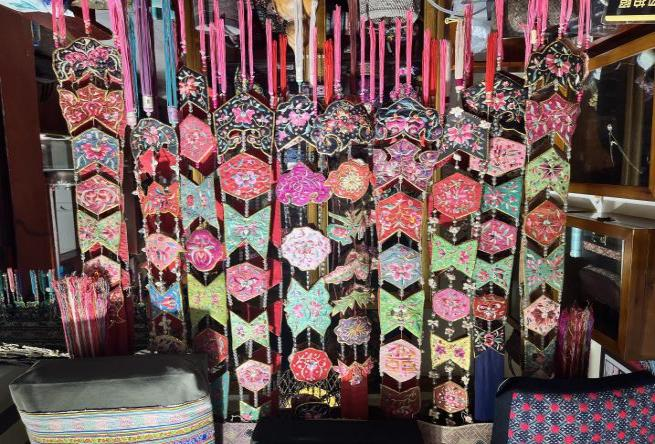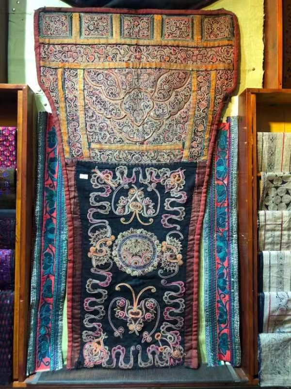 这家苗族博物馆是一家私人苗族绣品店。老板金花来自贵州省台江县施洞镇的苗绣世家,她是当地的苗绣非遗传承人。博物馆内的大部分刺绣图案或纹样都有相应的传说或来历。
