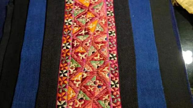 苗绣中,有一个著名的传说与彩线有关,即苗族女首领兰娟为了记住迁徙跋涉的路途经历,发明了用彩线记事的方法。她在过黄河时绣条黄线,过长江时绣条蓝线,翻山越岭也绣个符号标记。当最终抵达可以落脚的聚居地时,她的衣服已经从领口绣到裤脚,全部绣满了图案。后来,为了纪念英勇的前辈以及缅怀离去的故土,苗族姑娘在出嫁前都要为自己亲手绣制一套嫁衣。