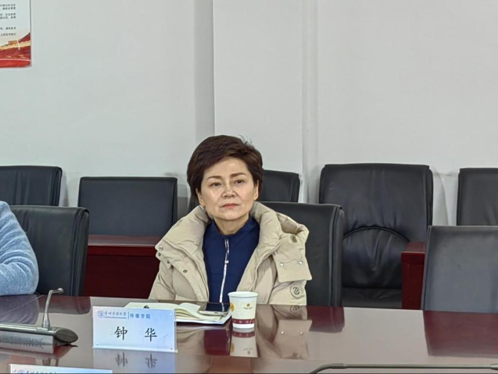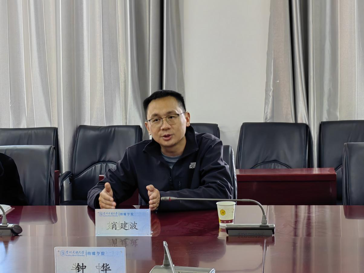 院长钟华对贵州广播电视台一行的到来表示热烈欢迎,并介绍了学院在传媒人才培养、学科建设及科研创新等方面的优势成果。她表示,“智联播创·越峰营”行动计划与学院培养应用型、创新型传媒人才的目标高度契合,期待双方以具体项目为抓手,为学生搭建优质实践平台,助力课堂教学与行业前沿技术、真实业务场景深度对接。