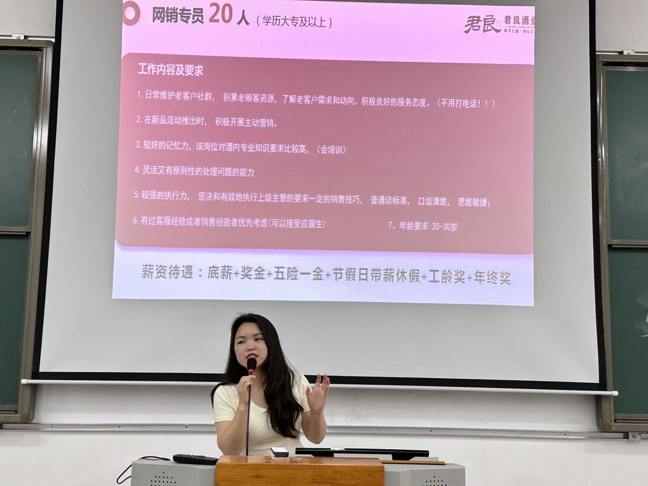 随后,君良酒业的招聘人员介绍了公司的核心竞争力。借助互联网浪潮,该公司采用“互联网+白酒”的运营模式,从而紧跟市场脉动,满足了不断变化的市场需求。在分享过程中,他们详细阐述了公司概况、福利待遇、薪酬体系以及岗位需求等,使毕业生们可以根据自身意向选择合适的岗位。